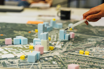Ausgehend von den Planungen der neuen Quartiere und ihrer sozialen Angebote wurden verschiedene Raumprogramm-Varianten entwickelt. Mit Hilfe eines Baukastensystems und einer Luftbildmatte kamen die Beteiligten über Struktur, Verortung, mögliche Synergien und Machbarkeit ins Gespräch.