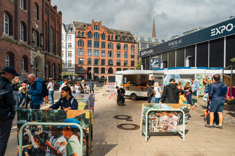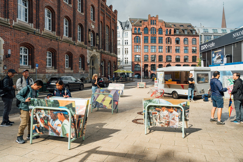 Auf dem Platz „Bei der Alten Börse“ vor dem Haus der Patriotischen Gesellschaft wurden die Ergebnisse im Rahmen einer interaktiven Ausstellung öffentlich gezeigt. Das gemeinsam gestaltete Modell gab Einblicke in die gesammelten Eindrücke der Tage, sowie in die Perspektiven der Kinder und Jugendlichen auf die Hamburger Innenstadt. Aufgebaute Tafeln zeigten das Konzept der Kinderstädte in Hamburg der vergangenen Jahre.