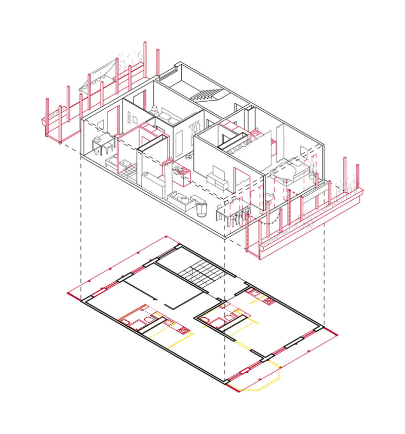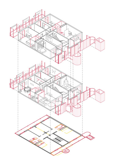 Das Zimmer für dich als ein Vor-Ort-Test schließt auf, um was es für die Einzelnen im Wohnen geht. So dient der Raum als Extra-Raum: zum Malen, Schreiben, Musizieren, Studieren. Ein Raum, der nicht unbedingt alltäglich, sondern temporär zu bestimmten Anlässen, Tätigkeiten und in spezifischen Konstellationen genutzt werden kann und soll. Das Teilen dieser Räume ist eines der Merkmale, die temporäre Nutzung das zweite, das Spielerische ein weiteres. Wir fragen uns: Wie kommt das Zimmer auf, an und in die vorhandenen Bestände? Wie können wir den hier erprobten Gebrauch in den Bestand einschreiben?Dazu wieder ein Testfall. Dieses Mal im Plan: eine Zeile, ein Bautyp WBS 70 in Neu-Hohenschönhausen in Berlin. Im Lesen der Grundrisse sehen wir viele ähnliche, aber auch besondere Situationen. Situationen, die aus dem “Raster” fallen. Wir schreiben diese spezifischen Situationen entsprechend fort. So wird das fünfte Zimmer einer Wohnung zu einem Treppenzimmer, welches aufs Dach führt und dieses nun für die Hausgemeinschaft erschließt. Aus vier Zwei-Zimmerwohnungen entwickeln wir eine Maisonette als Wohngemeinschaft und Cluster. Eine Ein-Zimmerwohnung verschalten wir mit einer Zwei-Zimmerwohnung, sodass Rückzug und Gemeinschaft zwischen Großeltern, Eltern, Jugendlichen und/oder Kindern in verschiedenen Lebenssituationen möglich wird.