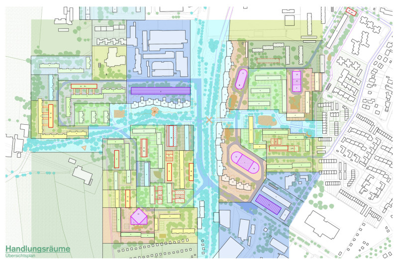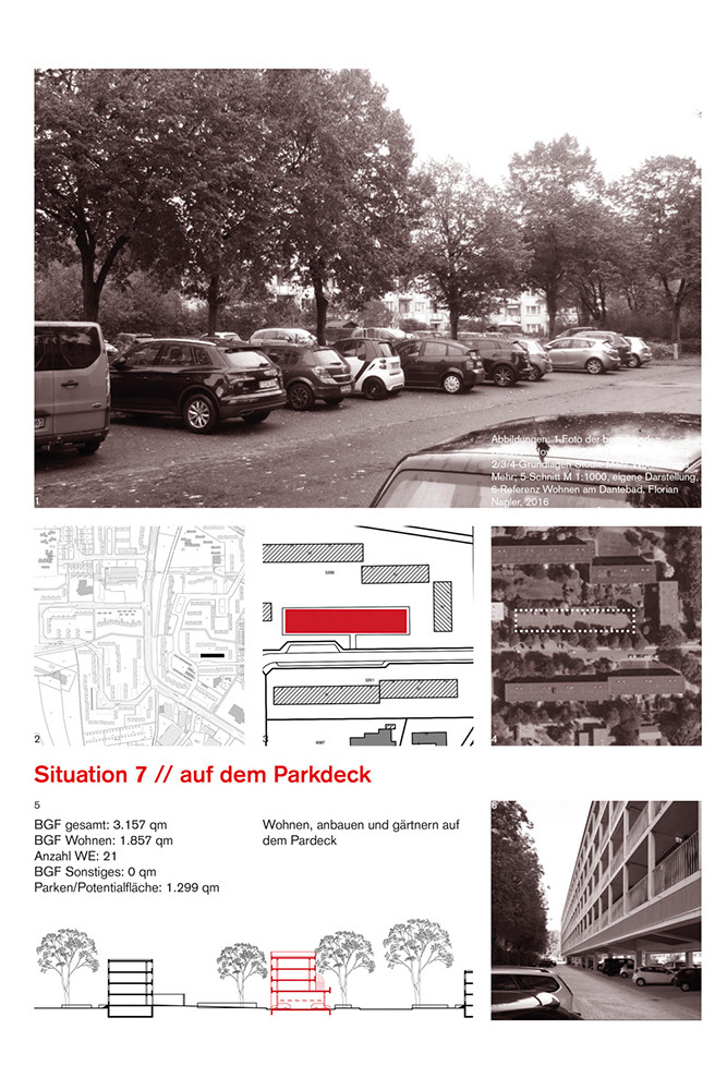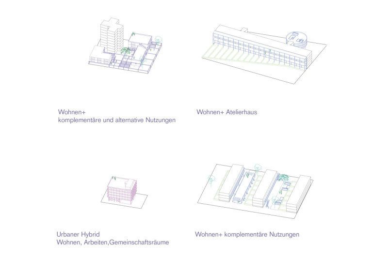 Beide Entwicklungskonzepte zielen darauf ab, eine Reorganisation, Urbanisierung und Diversifizierung der Quartiere zu ermöglichen. Initial ist die Überbauung der Parkplatzflächen, darauf folgen in Teilschritten die Ergänzungen und Neubauten. Bestehende Raumkanten, Grenzen und Schwellenräume verbinden sich selbstverständlich mit neuen und erneuerten baulichen und freiräumlichen Strukturen. Die Nutzungsmischung – insbesondere die angedachte Verbindung von Wohnen und Arbeiten, aber auch die Implementierung von alternativen Wohnformen - regt zur Integration unterschiedlicher Trägerschaften und Modellen im Bestand an.