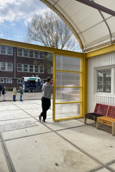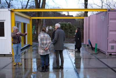 Im fortschreitenden Prozess der Umnutzung der ehemaligen Schule Lienaustraße in Hamburg Berne dient die temporäre Projektarchitektur den zukünftigen Nutzerinnen als Ort während der Sanierungsphase.