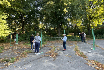 Gemeinsam mit den Nutzer:innen des zukünftigen Kulturzentrums wurden die Dimensionen und Ausrichtungen der Projektarchitektur auf dem Hof abgesteckt. Im Planspiel wurden unterschiedliche Konfigurationen diskutiert. Die Projektarchitektur soll dabei eine Abfolge an unterschiedlichen Räumen aufnehmen – die Anlaufstelle, eine Halle bzw. überdachten Außenraum und eine kleine Werkstatt.